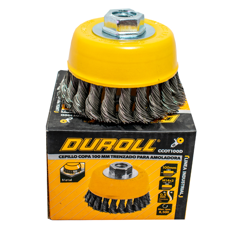 Cepillo de acero trenzado para amoladora, marca Duroll, ideal para limpiar zonas con gran corrosión o impurezas.