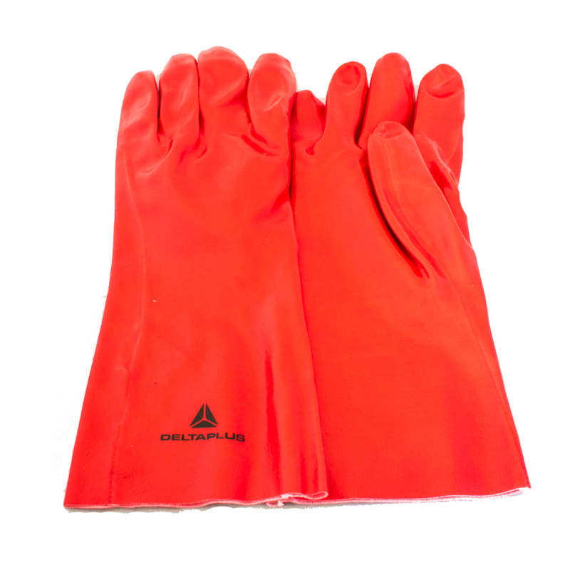 Guantes de PVC rojos de 40cm de largo, soportan combustibles, desengrasantes y otros químicos.